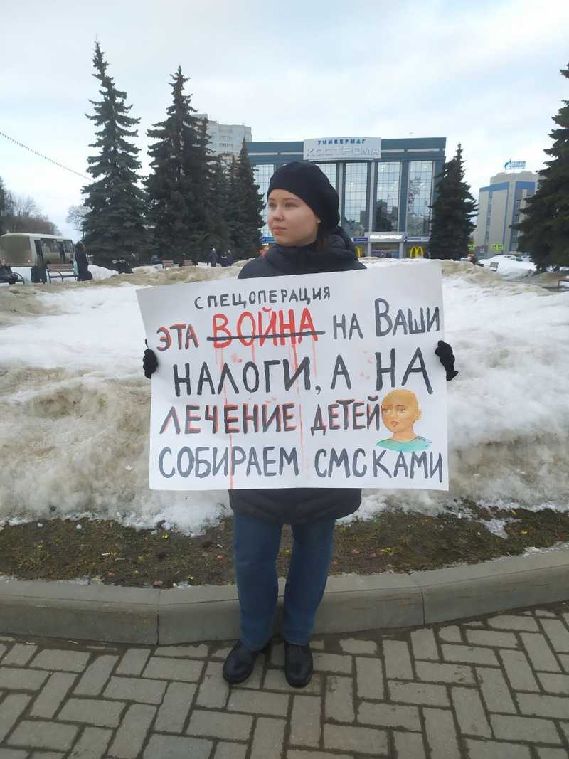 On 5 March, Irina Shumilova organised a solo picket with a poster that read “This war is funded by your taxes, while we crowdfund for children’s healthcare.” We should note that solo pickets do not require authorisation from the state.