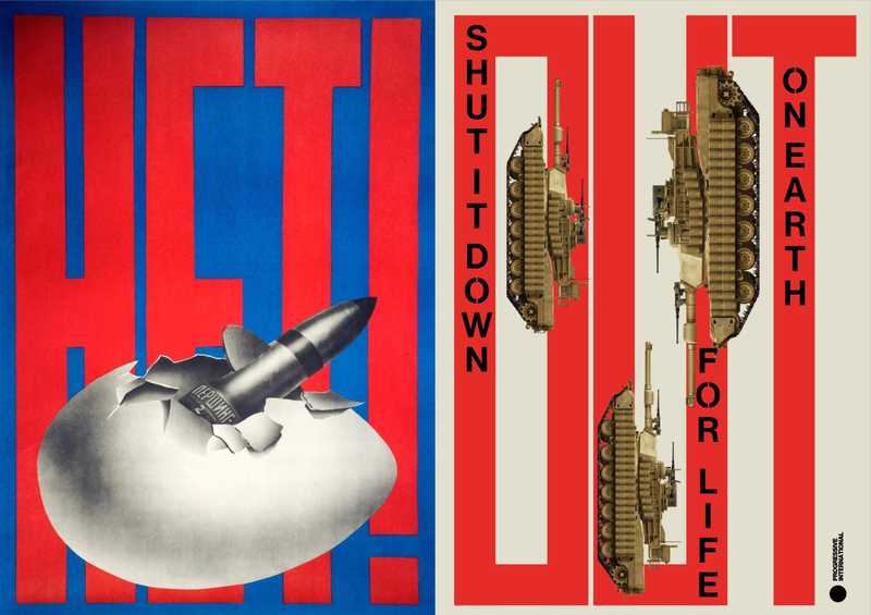 Art: On the left, an iconic Soviet anti-war poster said “NYET” to the placement of US Pershing-II nuclear missiles in Europe. The move marked a shift in the US nuclear doctrine from the logic of Mutually Assured Destruction, which said that nuclear weapons can never be used because they will lead to the destruction of both attacker and attacked, to the logic of “counterforce” power, which suggested that a nuclear war could be won with an overwhelming first strike. On the right, a campaign poster by PI Creative Director Gabriel Silveira, which says “OUT” to the infrastructure of US militarism everywhere.
