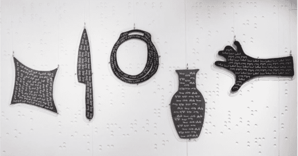 Each work is digitally embroidered with words and phrases derived from the media and local newspaper articles telling stories about honour killing, for example “junha” meaning "minor crime" and "as if she is a mechanical object who doesn’t own her body."