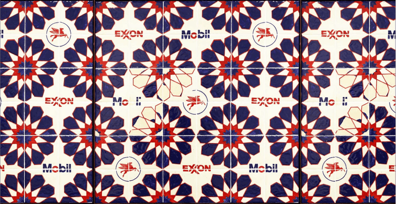 Art of the Week: Saj Issa (1994) is a Palestinian American artist working with installation, painting and ceramics. The featured work is from a series titled Americana Hammam from 2022, which pairs Islamic geometry with logos of ExxonMobil, the largest oil company in the United States.