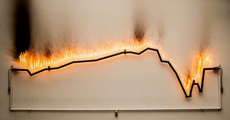 Art: Lester Rodríguez (1984, Honduras) is an artist, professor, and co-founder of the Experimental School of Art, based in Bogotá, Colombia. Rodríguez's work results from ongoing research on geography, regional crises, and migratory issues. For the context of Dow Jones*, Rodríguez was interested in the economic crisis, the impact of political discourse on financial flows, and the repercussions on the economy. Dow Jones tracks the stock market chart from December 2019 - December 2021, a time of interconnected yet seemingly independent issues including the pandemic, oil prices, Russia's invasion of Ukraine, and the U.S.-China trade war that affected exploited countries disproportionately.*