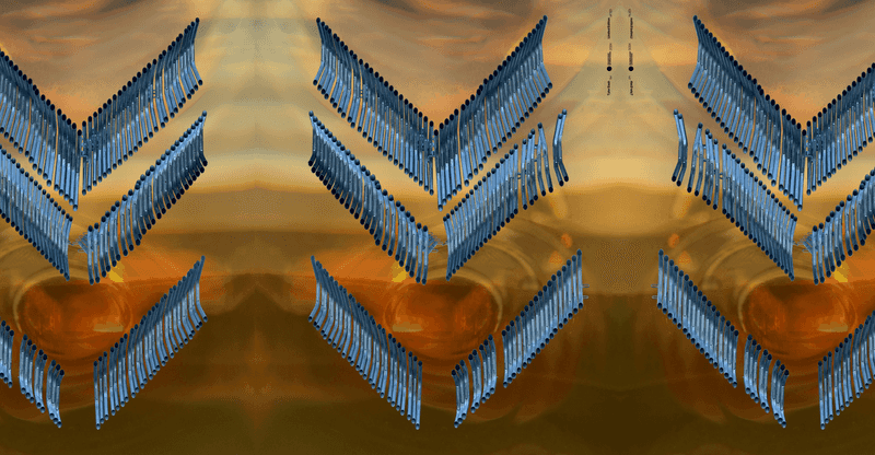 Flying Geese, Eashs limitierte Auflage für Progressive International, wurde von einer Ähnlichkeit in der Geometrie gestapelter Sicherheitsbarrikaden mit dem gleichnamigen Maidu-Korbmuster inspiriert. Durch die digitale Collage der temporären Absperrungen über Fotografien des offenen Himmels versucht Eash, ein westliches Objekt der Kontrolle und Autorität in ein indigenes Symbol für Freiheit und Solidarität zu verwandeln.