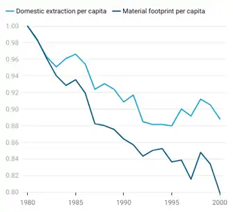 Cependant, il est crucial de noter que l'« empreinte matérielle » (EM) par habitant de l’Afrique a chuté de manière nettement plus importante que l’extraction domestique (figure 1). La MF fait référence à la quantité totale de matières premières consommées en Afrique, y compris celles intégrées dans les biens importés et à l’exclusion de celles incorporées dans les biens exportés. Les données du MF indiquent que la consommation en Afrique a chuté de 20 % de 1980 jusqu'à la fin des années 1990, et n'est revenue à ses niveaux antérieurs qu'en 2013. La baisse de consommation Africaine a été plus marquée que celle de la production.