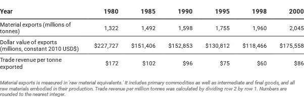 Nous pouvons voir ce modèle lorsque nous regardons les données d'exportation. La figure 2 montre les exportations africaines de 1980 au début des années 2000, mesurées à la fois en termes de dollars et en « équivalents matières premières ».[1] Notez que les équivalents matières premières incluent les exportations de matières premières, ainsi que les biens intermédiaires et finaux, et toutes les matières incorporées dans leur production. Ces données confirment que, tandis que la consommation de matériaux en Afrique diminuait, les exportations de matériaux augmentaient à un rythme rapide. En d’autres termes, il semble que la capacité de production et la production matérielle de l’Afrique aient été réorientées des besoins régionaux vers les exportations. Cependant, bien que les exportations physiques aient augmenté, le montant total d'argent que l'Afrique recevait pour celles-ci a diminué. Alors que les valeurs physiques et monétaires des exportations ont augmenté en tandem au cours des années 1970, il y a eu une rupture spectaculaire dans les années 1980 et les deux ont divergé. Cela indique que les prix des exportations africaines ont été écrasés, de sorte que l'Afrique gagnait moins par unité d'exportation (voir Tableau 1).