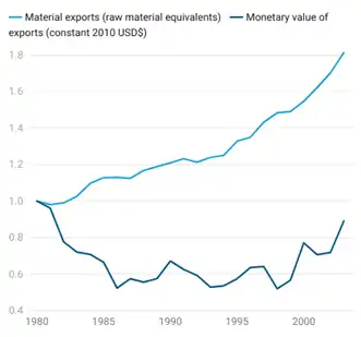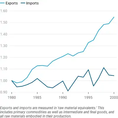 Ces schémas aident à expliquer pourquoi les gouvernements et les capitalistes du Nord global ont été si prompts à imposer des PAS à l'Afrique, malgré les coûts humains manifestes. En réduisant la consommation africaine, en écrasant les prix africains et en réorganisant la production autour des exportations, les programmes d'ajustement structurel ont conduit à une augmentation marquée des « échanges écologiques inégaux », un processus par lequel les pays africains sont contraints d'exporter plus de matériaux, d'énergie et d'autres ressources qu'ils n'en reçoivent en importations. En abaissant les prix des exportations africaines par rapport aux importations, les Programmes d'Ajustement Structurel (PAS) ont favorisé l'accroissement des sorties de matériaux. Pendant que les importations ont stagné, les exportations ont augmenté. Les capacités productives et les ressources de l’Afrique qui auraient pu être investies dans l’industrialisation souveraine et le développement humain ont été au contraire dépréciées et exportées pour soutenir l’accumulation dans le noyau impérial.